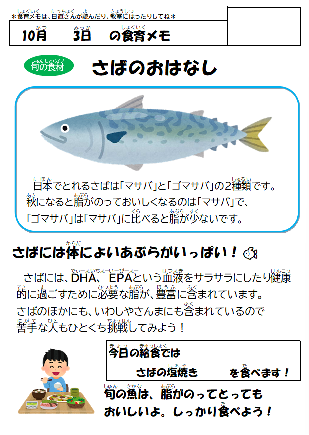 今日は旬のさばを塩焼きにしました。脂がよくのっていて、おいしいさばでした。