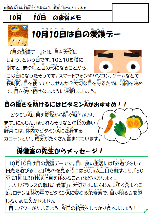 10月10日は「目の愛護デー」です。目によいとされるβカロテン(ビタミンA)を多く含む、にんじんをたっぷりと使いました。