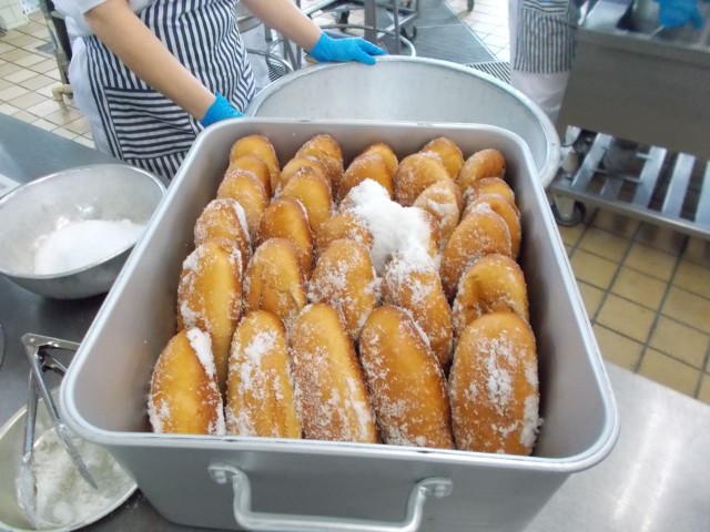 今日の揚げパンは、砂糖をまぶした揚げパンです。いつもはきなこ揚げパンですが、夏頃に「お砂糖の揚げパンを食べたい!」という4年生からのリクエストがあったので、今回は砂糖の揚げパンにしました。「甘くておいしい!」「こっちの方が好き!」「きなこのほうが好きかも…」「桑の葉の揚げパンがまた食べたい!」など、さまざまな反応がありました。どのクラスもたくさんの子供たちがおかわりをしてくれていて、残菜もほとんどありませんでした!