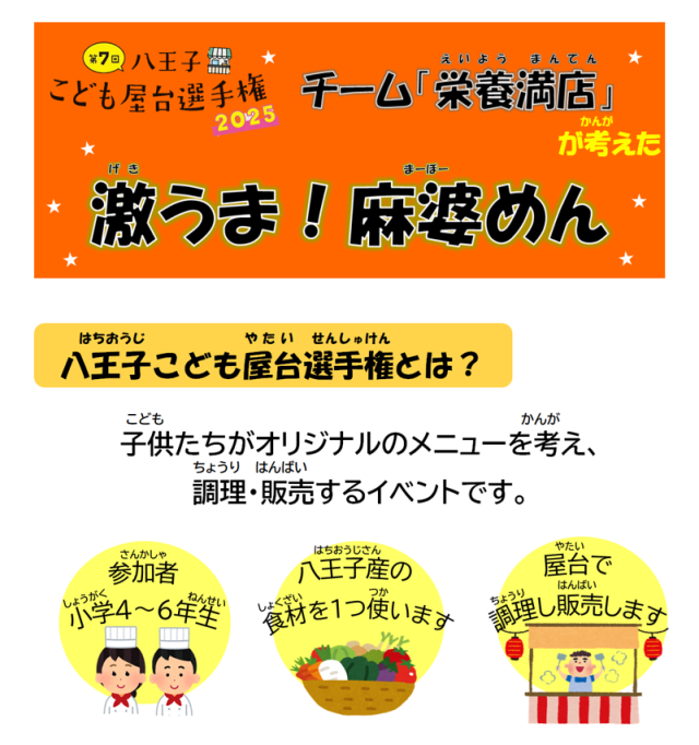 10月26日(日)に南大沢駅前のペデストリアンデッキで「八王子こども屋台選手権」が開催されました。由木東小学校からは2チームが出場し、今日の給食では、チーム「栄養満店」の皆さんが考えた「激うま!麻婆めん」を給食バージョンにアレンジして提供しました。