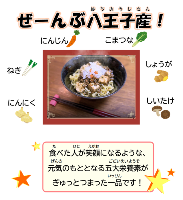 激うま!麻婆めんは、”八王子産の野菜をたっぷり使って、こっそり栄養満点に”というコンセプトで、使用している野菜やきのこは全て八王子産、五大栄養素のバランスがよいことが特徴です!
