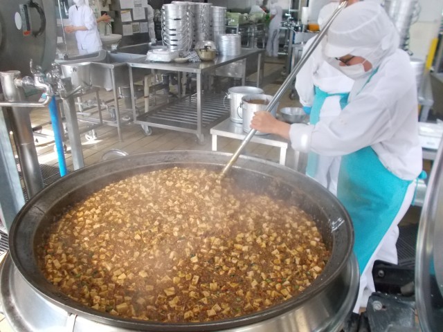めんは、90kgのむし中華めんにごま油をまんべんなくまぶして蒸し焼きにしました。蒸しあがっためんからは、ほんのりごま油が香って食欲をそそります。麻婆豆腐ともよく合いました。