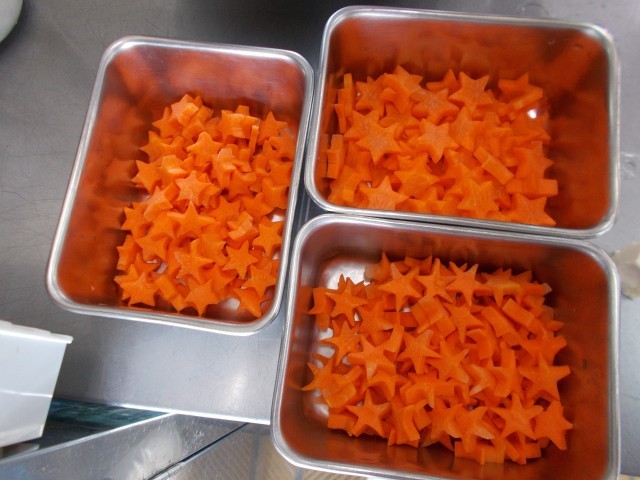 写真3枚目:星型にくり抜いたにんじん。ゆでてから、各クラスのめんの上に散らしました。