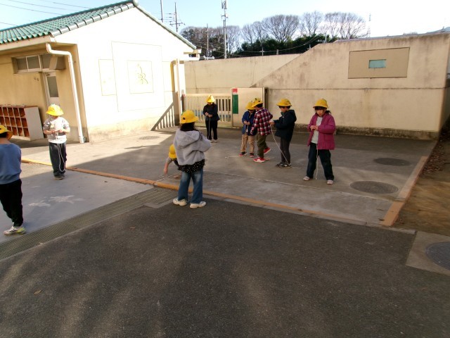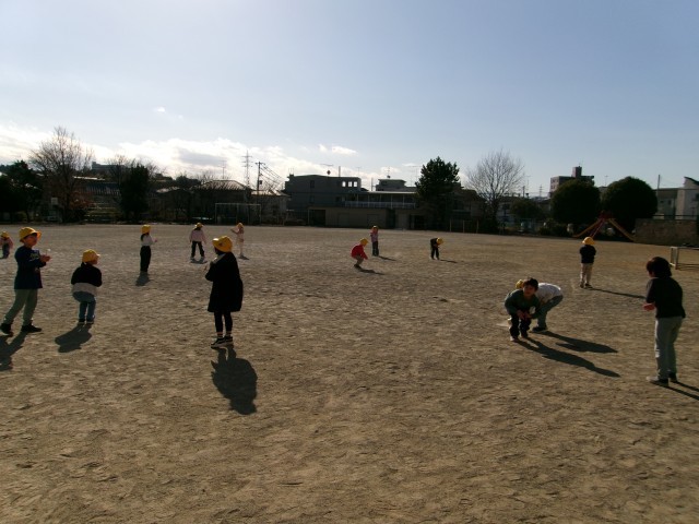 晴れた青空の下、外で正月遊びをしました。こまと、はねつきと竹とんぼを楽しみました。