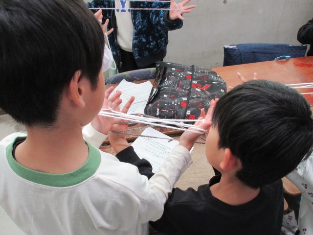 2年生が1年生に昔遊びの遊び方を教える活動を行っています。