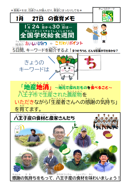 今日のキーワードは「『』地産地消」です。給食では、八王子産の食材を積極的に使い、地産地消を推奨しています。特に野菜が豊富で、旬の新鮮な野菜を毎日使うことができます。1月は、白菜・長ねぎ・にんじん・キャベツ・小松菜・さつまいもなどが八王子産です。