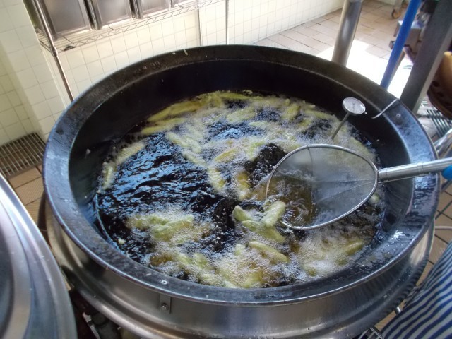 写真3枚目:桑都揚げを揚げている様子。桑都揚げは、笹かまぼこに桑の葉パウダーを混ぜた衣をつけて揚げた料理です。