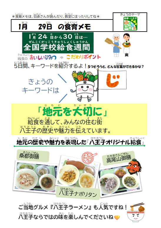 今日のキーワードは「『じ』 地元を大切に」です。給食では、八王子のご当地グルメである「八王子ラーメン」や「八王子ナポリタン」を提供しています。また高尾山をイメージした「高尾山御膳」、養蚕・絹産業が盛んだった歴史を表した「桑都御膳」、八王子の伝統芸能である“車人形”をイメージした「車人形御膳」など、八王子の歴史や魅力を給食を通して子供たちに伝えています。自分の生まれ育った街を大切にする“郷土愛”を、食を通じて育んでいってほしいです。