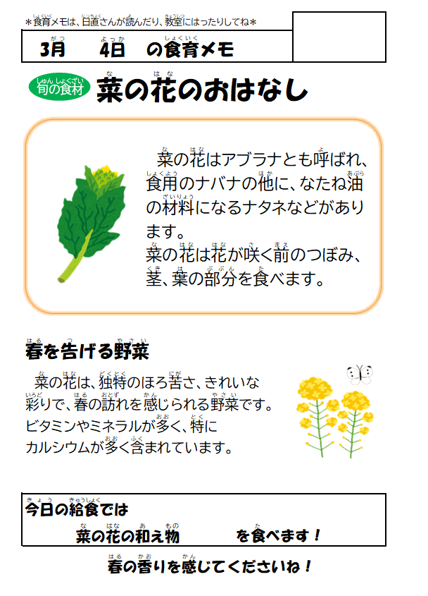 今日は春の訪れ感じる旬の「菜の花」を、小松菜やにんじん・コーンと一緒に和え物にしました。苦みが少なく、子供たちにも食べやすかったようです。