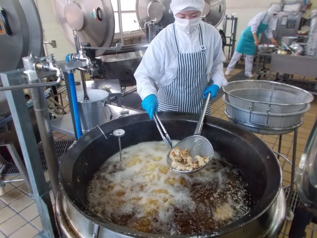今日は“入学・進級お祝い献立”です。お赤飯を炊き、すまし汁には桜の形をしたかまぼこを入れました。メインのおかずは子供たちが大好きなとりのからあげです!「すごくおいしい」「もう一個食べたい!」と大好評でした。