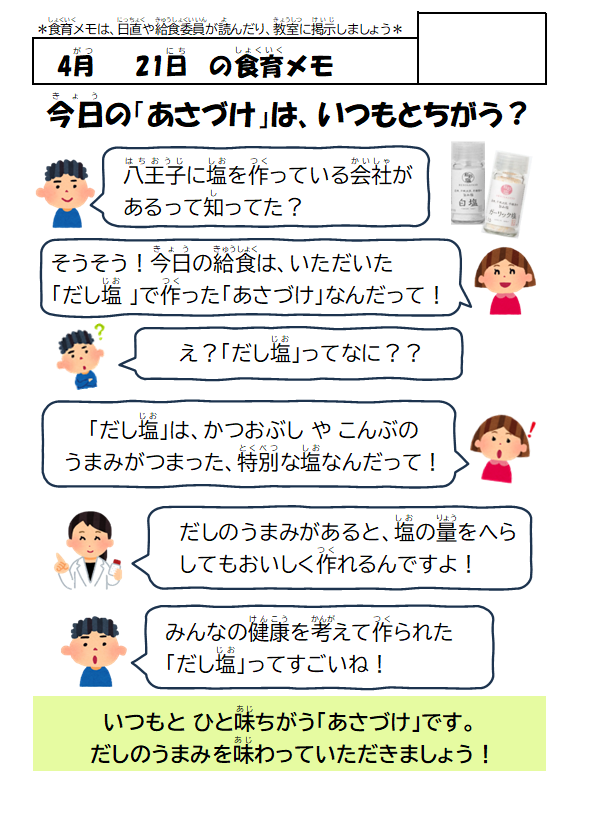 今日は、市内の食品会社から寄贈していただいた“だし塩”を使った浅漬けを食べました。