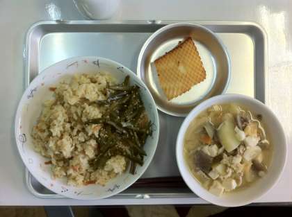 切り干しごはん・いかの松笠焼き・とん汁・くきわかめのにんにく炒め・牛乳