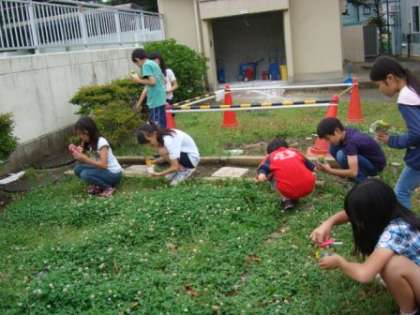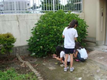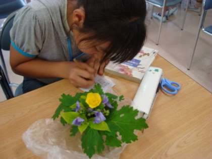 11日(月)4年生以上が参加するクラブ活動の時間、カルチャークラブでは校庭の隅々に生えている草花を採って、ミニ生花を作りました。プリンカップに小さなオアシスと水を入れて出かけました。花を探してから教室に戻って仕上げます。