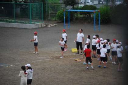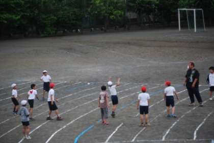 12日(火)4時間目に5年1組・2組合同でソフトボール投げの計測をしました。決められた円から出ないようにして2回投げます。昨日、ソフトボール投げの計測用に校庭に引いた線を目印に、先生が距離を読み上げてくれました。「エイッ!」「36m」