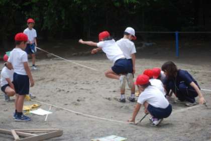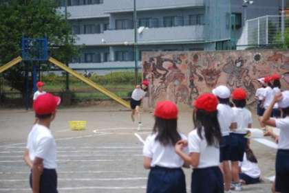 14日(木)3時間目に3年生がソフトボール投げと立ち幅跳びを計測していました。立ち幅跳びは、砂場のわくに足をそろえて、全身を使って跳びます。係の子供が跳んだ長さを測ってくれました。