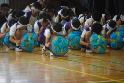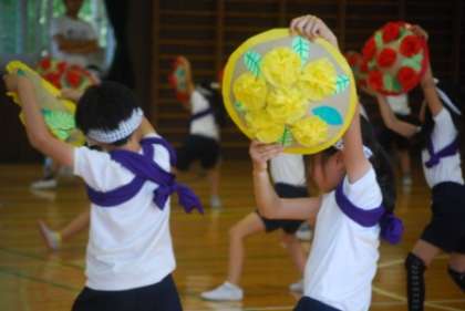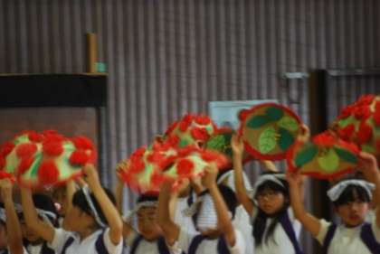23日(木)花笠の練習も佳境です。3色の傘がゆれて、一人一人踊りに熱がこもってきました。
