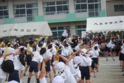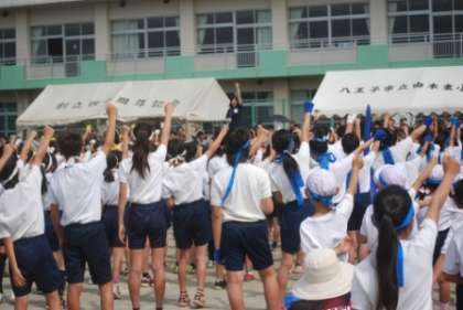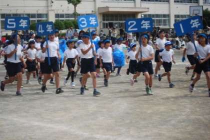 由木東小学校オリジナルの運動会の歌、準備運動と進み、いよいよ競技と演技の開始です。