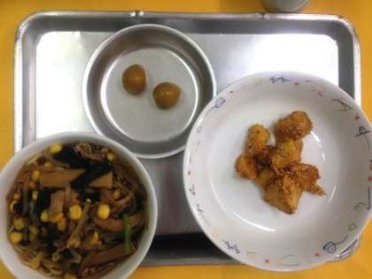 さつまいものあめがらめは、皮をむいて乱切りにしたさつまいもを素揚げして、さとう・しょうゆ・酢・水を煮立てたものをからめ、白ごまをふりました。外はカリッと、中はホクホクでした。