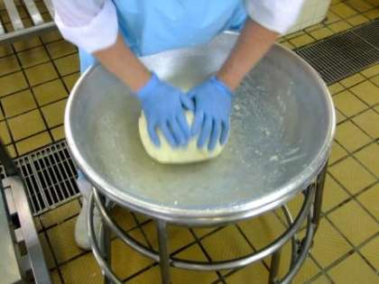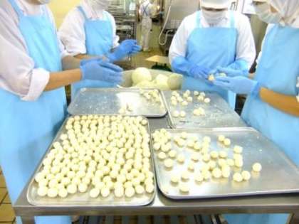 お団子は粉に水を加えてこね、ひとつひとつ給食室で丸めてゆでた、手作りのお団子です。かぼちゃで色をつけました。