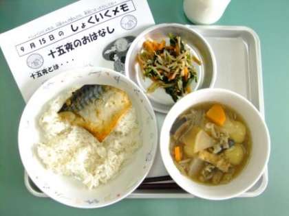 麦ごはん・さばのごまみそ焼き・お月見だんご汁・煮びたし・牛乳