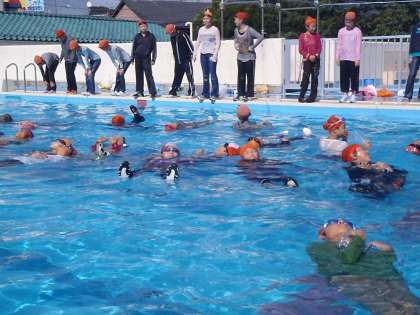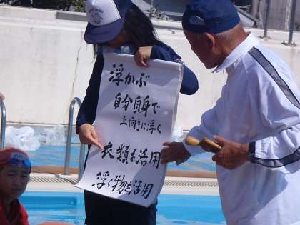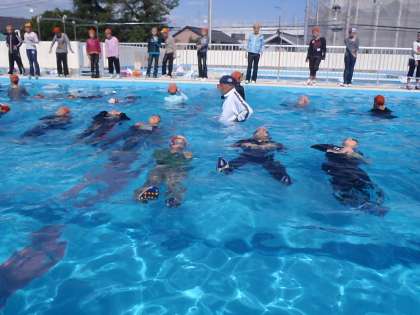 地域の方に講師としてきていただき、お話を聞いた後、実際に着衣泳の体験をしました。