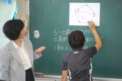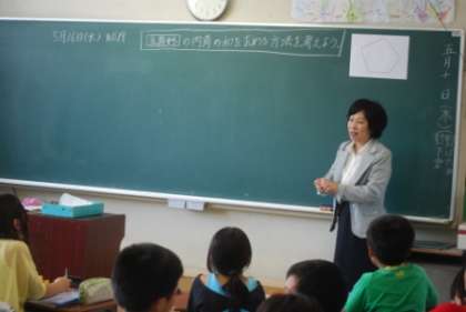 16日(水)5時間目に研究授業がありました。5年生の算数で竹村先生が授業をしました。今日の課題は「五角形の内角の和を考えよう」です。今まで学習した内容をいかして、三角形や四角形に分けて考えていました。答えの求める時、「たし算作戦」「三角形に分けちゃお作戦」等、各自で作戦名をつけて求めることができました。