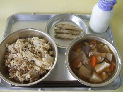 ししじゅうし・わかさぎのから揚げ・のっぺい汁・牛乳・・・毎月19日は食育の日。しししじゅうしは、沖縄の郷土料理を給食風にアレンジしました・豚肉・昆布がはいった混ぜご飯。わかさぎは、今が旬の骨まで食べられる小魚。汁には、たっぷりの野菜・豆製品を使いました。