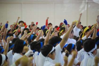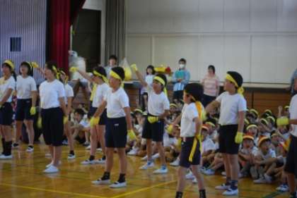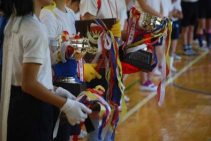 23日(水)1時間目は体育館で全校練習です。開会式・閉会式や応援の練習をしました。応援歌を元気いっぱい歌ったり、優勝杯などの返還や授与を行ったりしました。さて、今年の優勝杯は、赤青黄白、果たしてどの色に手渡されるでしょうか。
