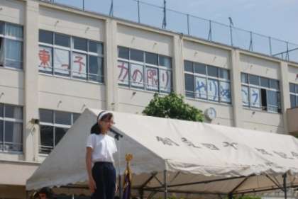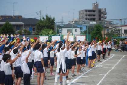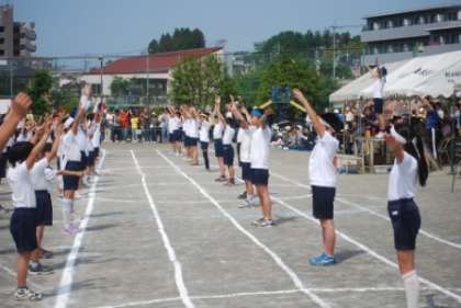代表と一緒に今年のスローガン「東っこ 力の限り やりぬこう」を、みんなで声を合わせて言いました。運動会の歌、準備体操がだんだんと気持ちが高まってきました。