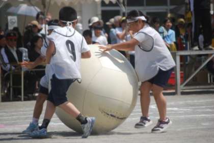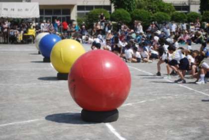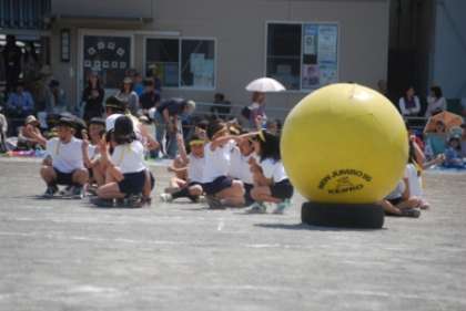 プログラム3番はね2年生の「ころがせ ころがせ」です。3人で大玉を転がしていき、