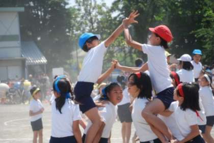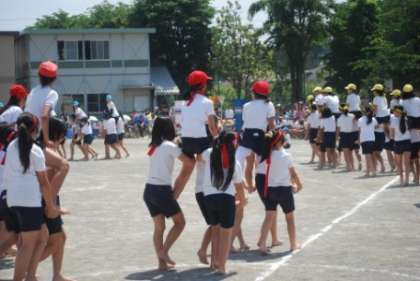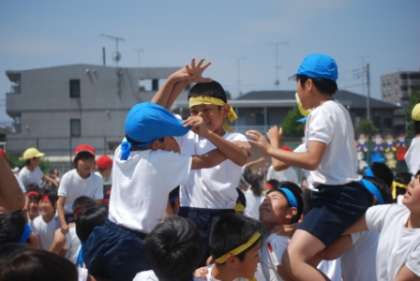プログラム6番は、5・6年生による「大栗川の乱」です。女子戦、男子戦がありました。4色入り乱れての戦いで、他の色より一騎でも多く帽子を取ろうと必死でした。