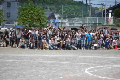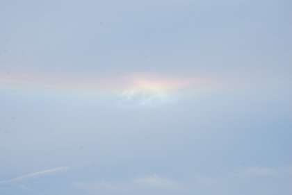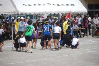 この少し前、今年の運動会を祝福するかのように雲の一部が虹色に。地上では審判係も保護者も短距離走を待ちます。