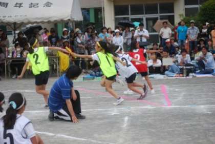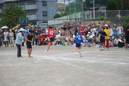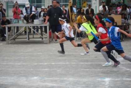 午前の部の最後を飾るのは、4年生以上の選手による女子リレー。一人一人が校庭を一周してバトンをつなぎます。練習の成果を発揮して走りぬきました。