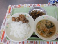 *今日のこんだて**ごはん  ホキのごまがらめ  茎わかめのきんぴら かきたま汁...