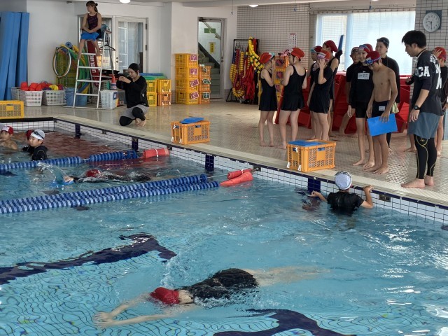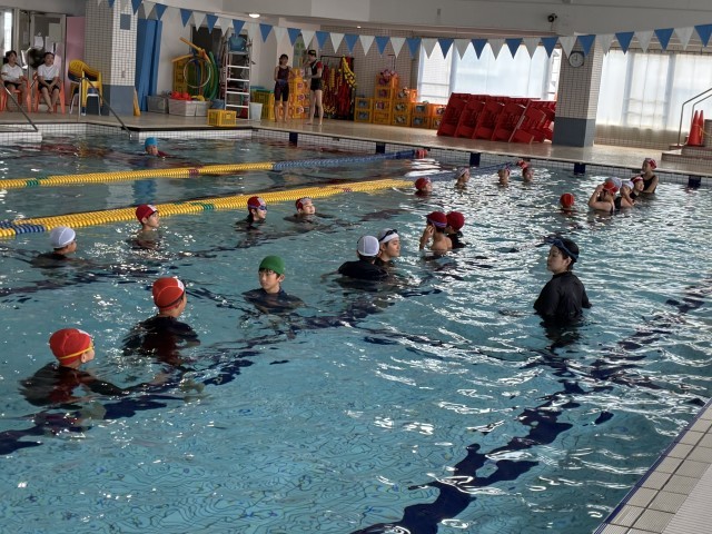 今日から456年生はアクラブでの水泳授業が始まりました。バスで10分程の道のりですが、子どもたちはプチ遠足気分。しかしプールでは、担任やスイミングスクールのコーチの指導のもとで、しっかりと授業に取り組んでいました。