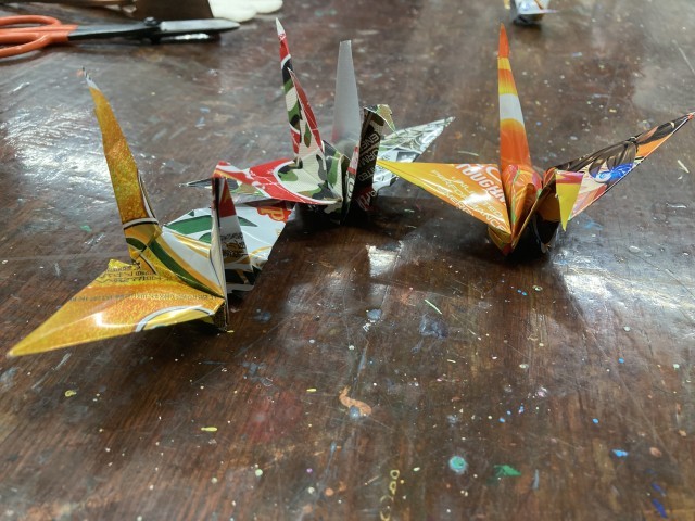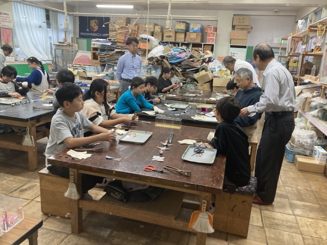 子どもたちは「つかみばし」という大きなペンチのようなものを使って、折線に沿ってアルミの板を丁寧に曲げていきます。6人もの講師の方が来て、とても丁寧に教えてくださったので、みんな上手に作り上げることができました。出来上がった鶴はいただいたクリアケースに入れて、図工室前に飾る予定です。ご来校の機会がありましたら、ぜひご覧ください。