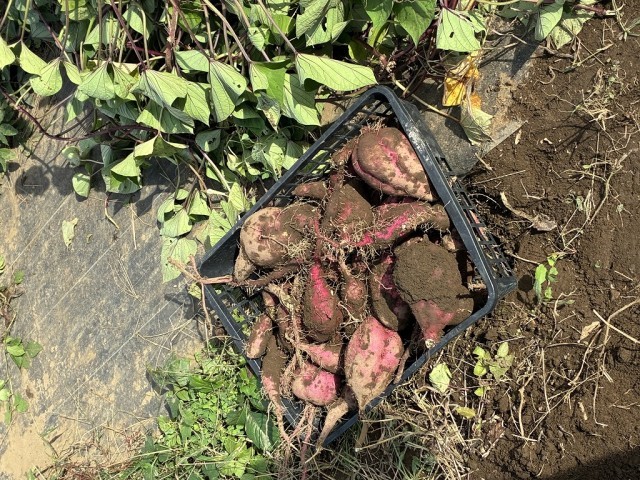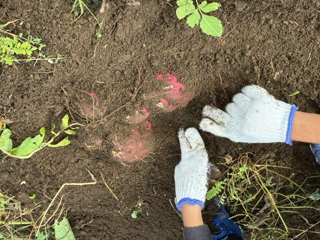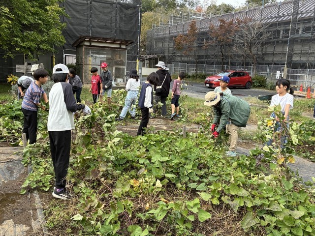 朝の雨に心配しましたが、5時間目の由木西レンジャーは無事に行うことができました。地中のお芋はどのくらい大きく育ってくれているか気になる子どもたち。先生から今日の活動の説明を聞いた後、①芋のツルを取る ②芋掘りをする ③芋のツルの葉を取り、輪にしてリースを作る ④落とした葉や残ったツル、道具の片付け・・・の順に張り切って作業を行いました。今日は由木西レンジャージャンボで約1時間の活動でしたが、みんな時間いっぱい頑張っていました。