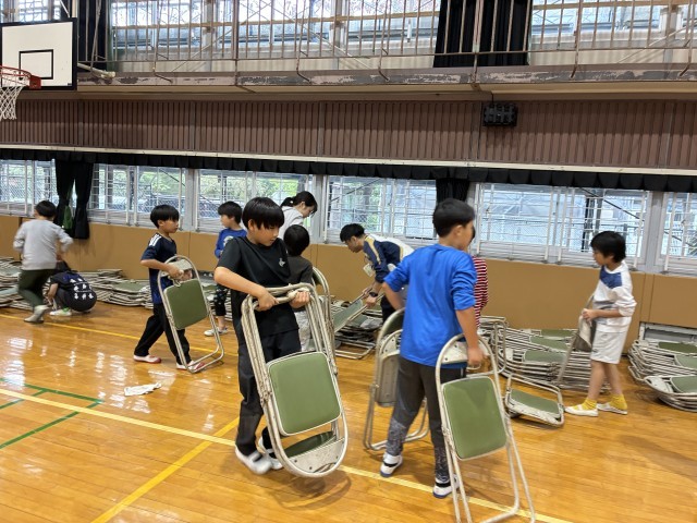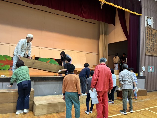 5校時は全員が体育館に集まり、これから少しずつ練習が始まる学芸会の会場準備を行いました。床を綺麗にしたりひな壇やパイプ椅子を出したりと手分けをして作業していました。児童下校後は先生や主事さんが照明や音響の設置、ひな壇の固定等も行いました。