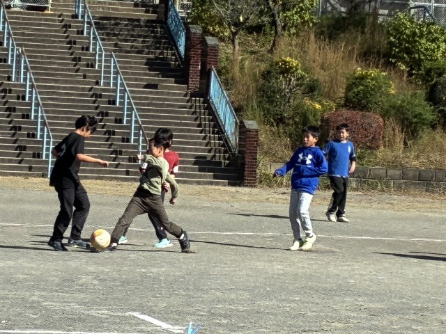 澄み渡った青空のもと、中休みの校庭では元気にサッカーを楽しんでいました。今日は子どもたちや担任の先生のほか、校長先生や教育実習の先生も混じり、みんなでボールを追いかけていました。