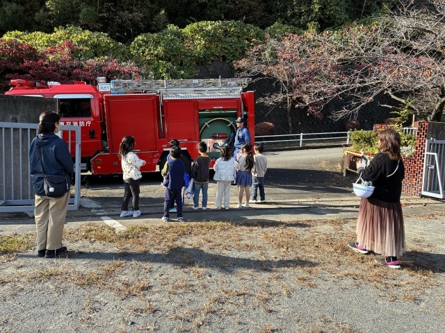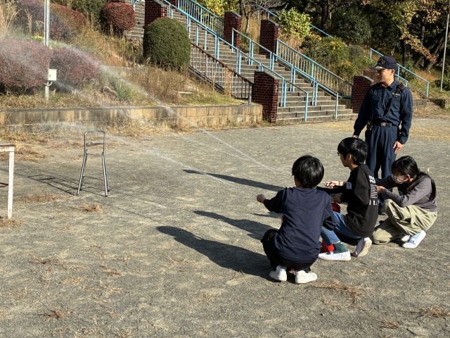 5時間目の避難訓練には、八王子消防署由木分署から消防自動車に乗った4名の消防士さんが来てくださいました。児童の避難訓練の様子を見てもらい、感想と避難の際のアドバイスをいただきました。万が一、煙の充満した空間で前が見えにくい状況になった場合、少しでも明るい方向を目指したり、手探りで壁づたいにドアを見つけたりして、あきらめない気持ちが大事という話が心に残りました。その後、4,5,6年生は消火器の使い方についての説明を受け、5,6年生数名が実際に水の入った消火器で練習をしました。また、1年生は国語の授業で学習中の「はたらくじどうしゃ」に関連し、大きくて立派な消防自動車を見せてもらっていました。