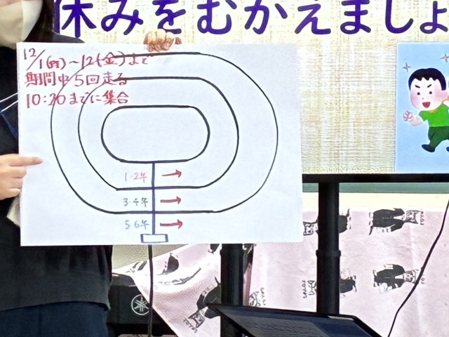 今日から師走、12月らしい寒さで始まった月曜日です。校長先生からは「あいさつ、アタック、後片付け」の振り返り、生活指導の先生からは「整理整頓をしよう」などの話がありました。また、今日から2週間「持久走週間」が始まります。寒さに負けない健康な体づくりのためにも、友だちと一緒に楽しく、そして自分のペースで走りましょう!