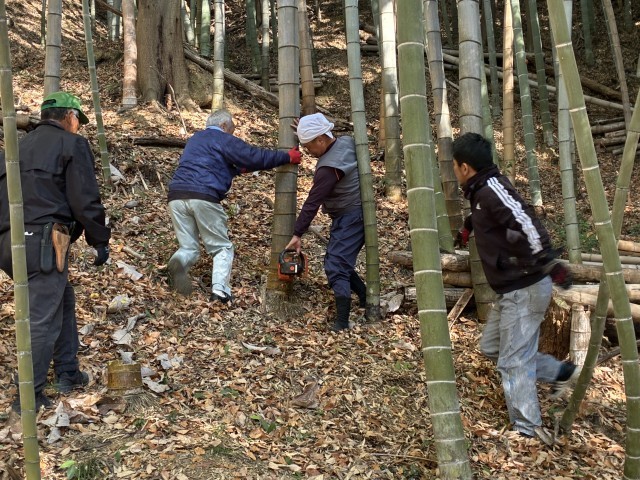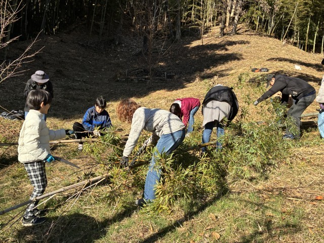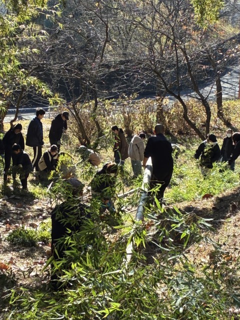 昨日、由木西小恒例の門松作りに使う竹の切り出しを行いました。学運協のみなさんや保護者、児童、教員等31名が参加してたくさんの竹を学校林から切り出し、門松作り用と冬まつり用に切り分けました。汗だくになっりながら全員で協力し、予定より早く作業を終えることができました。