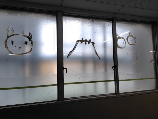工事業者のみなさんにメッセージを書き、窓に貼ったところ、窓を覆うビニールにお返事の絵を描いてくださいました🙌 また、丁寧にペンで描いたであろう作品とメッセージも窓に貼っていただきました。感激です。