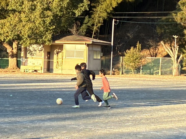 校庭に真っ白な霜がおりた8日、始業式前の朝7時40分から、朝サッカーに集まった由木西っ子が先生や友だちとボールを追いかけていました。冬の寒さに負けず、元気に過ごしてほしい3学期です。
