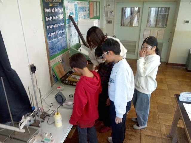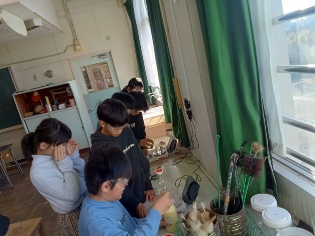 5年生は理科室で「水で溶けたものはどうなったか」について予想をたて、実験を行っていました。塩とミョウバンを使い、グループに分かれて実験をしたりノートをとったりしていました。
