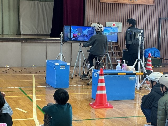 それぞれの学年から代表児童3名ずつ、計6名の児童がシュミレーターの自転車を運転し、場面をスクリーンで共有しながら起こりうる危険をみんなで考えました。