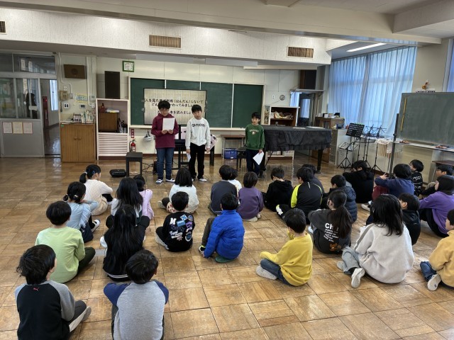 もうすぐ立春、そして明日は節分です。校長先生からは鬼に関する絵本を紹介し、いい鬼も悪い鬼も色々いる物語をもとに、「見かけだけでは分からない、どんどん人とかかわってみよう」という話がありました。また5年生からは国語の学習「生活をよりよくする提案」として、「廊下を走らない」「音楽室の楽器を大切に使おう」の2つが全校に向けて提案されました。