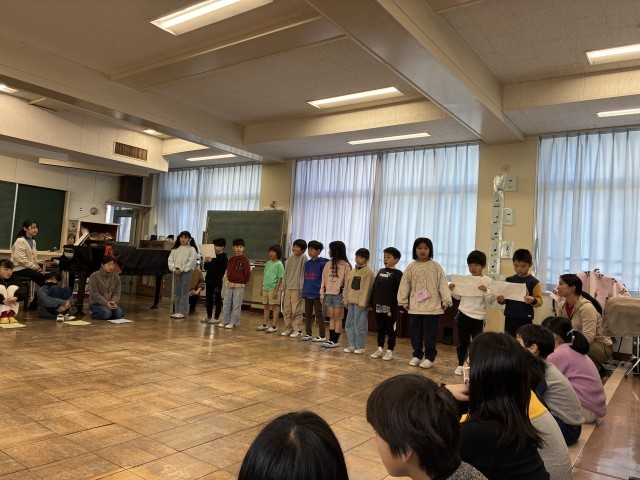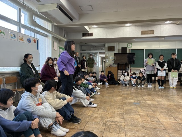 今朝の児童集会は1.2年生による音楽発表会でした。始めに全員で「君の空 見上げて」を二部合唱したあと、1.2年生が「はる なつ あき ふゆ」の歌を歌いました。歌詞をしっかり覚え、季節によって歌い方を変えながら元気に歌っていました。6年生が感想を発表してくれました。