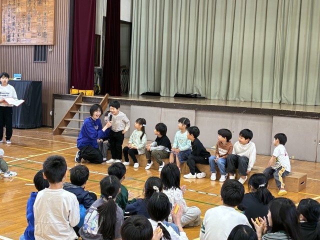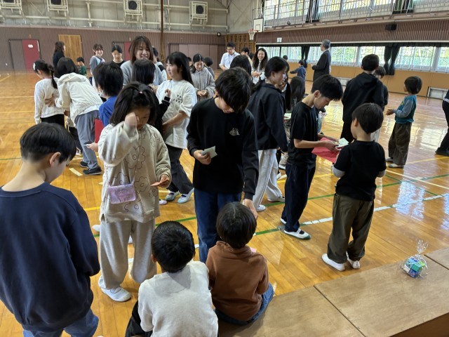 今朝の児童集会は1年生を迎える会、6年生と手を繋いだ1年生10名の入場をみんながあたたかい拍手で迎えました。1年生の自己紹介後、それぞれがつくって来た名刺をジャンケンで交換するゲームで盛り上がり、早速仲よくなりました。
