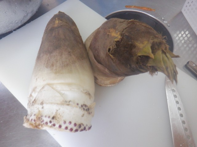 旬を迎えるたけのこをごはんでいただきました。生のたけのこを給食室で茹でました。